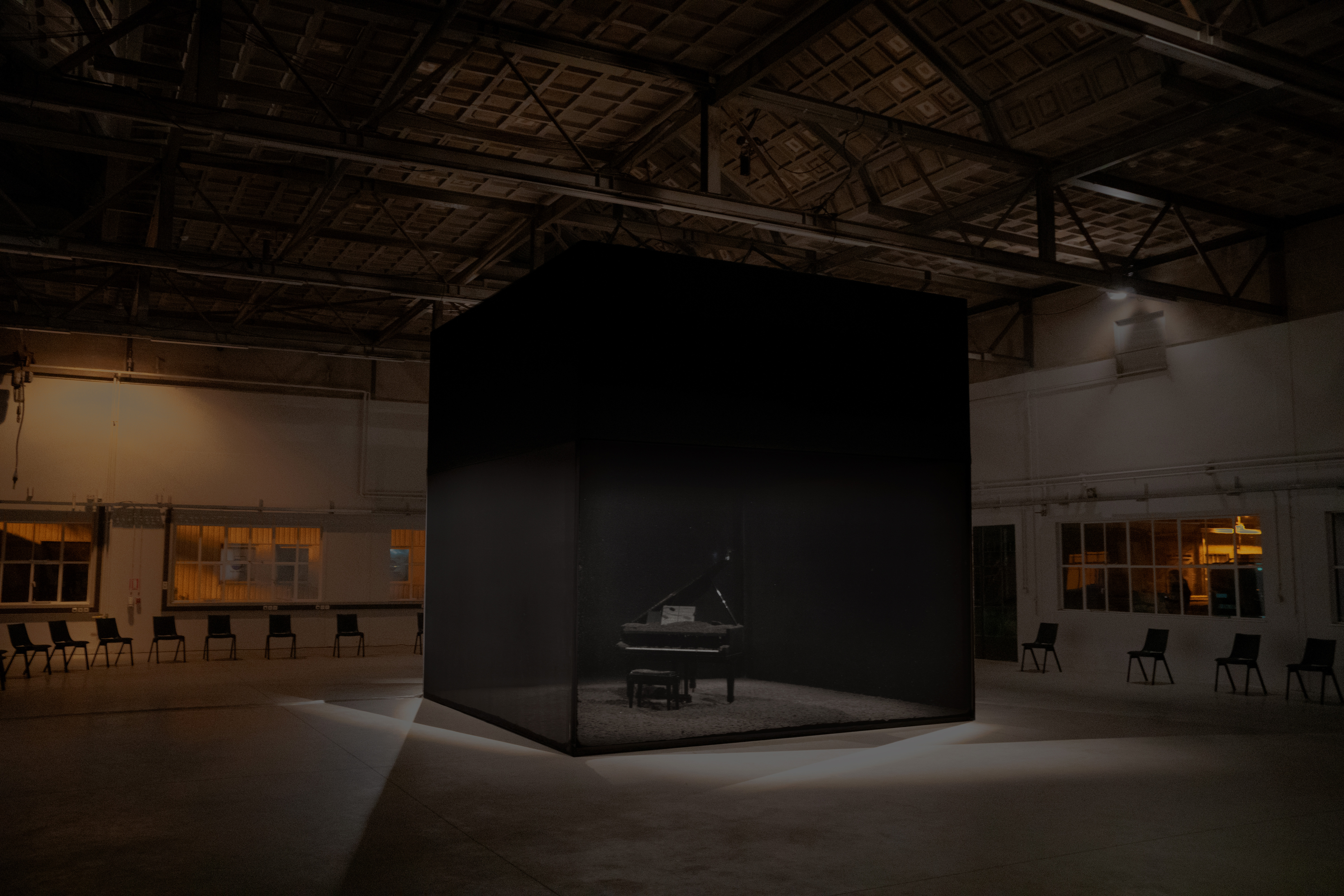 In this musical performance Karl Van Welden works with the impact of volcanic ash on music and on the pianist (Frederik Croene) who produces the music. At the outset, volcanic ash particles fall gently and harmlessly enough. After a while, the dark volcanic ash rains down exponentially on the musician and his instrument, slowly but surely transforming the sound and image.